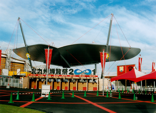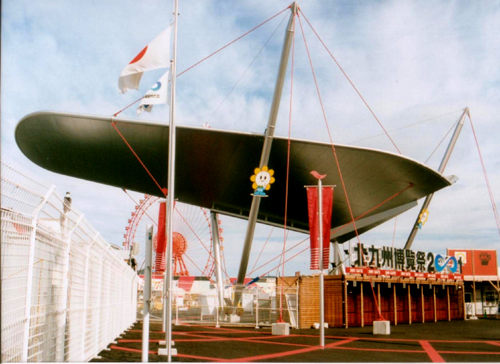 Suspending 50m wide “Wing” by 4 posts and tension rods. Vibration-controlled by original visco-elastic damper for tension structure.