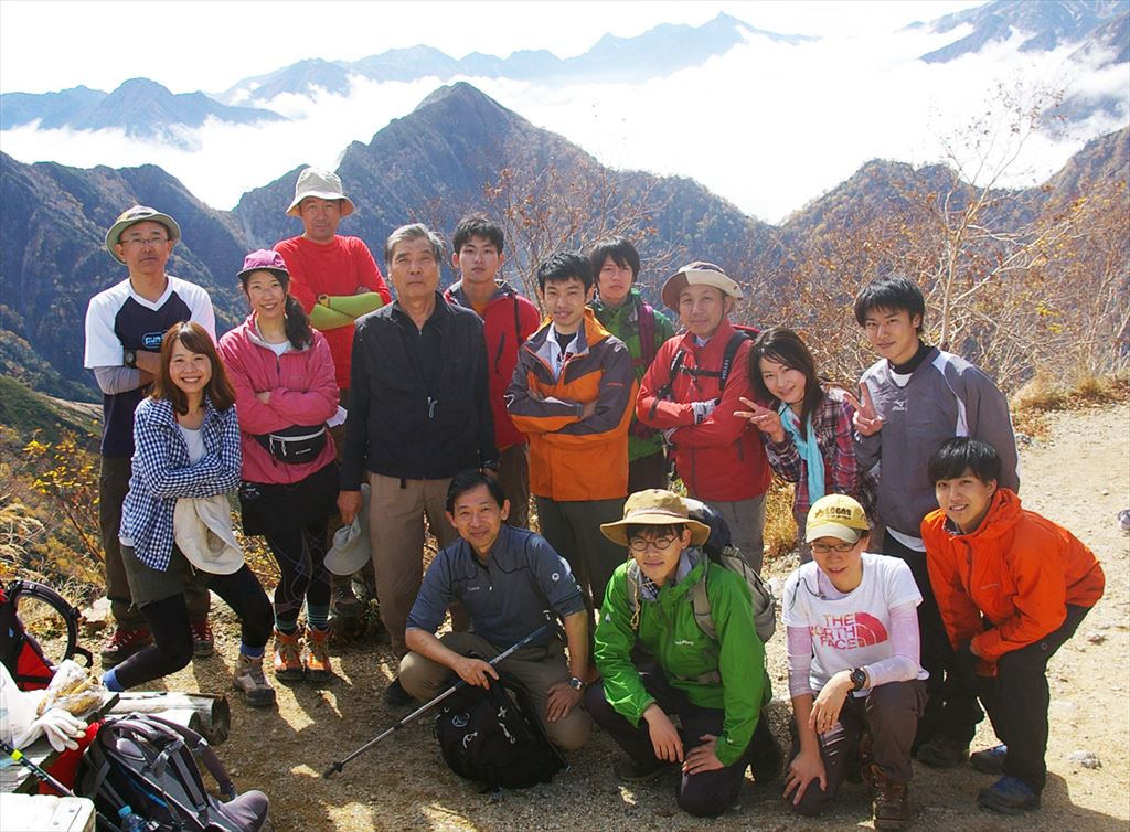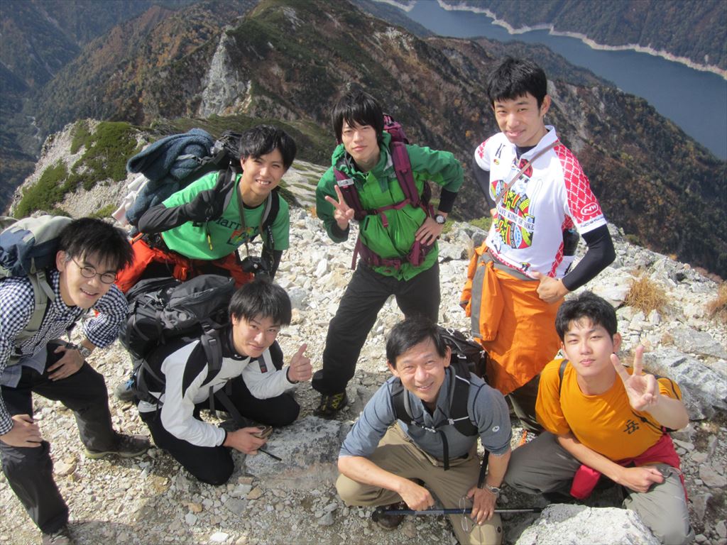 針ノ木岳山頂にて集合写真。後ろに見えるのは黒部ダム。