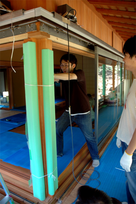 昨年度実験を行った移動式ガラス制振壁を付加した 在来軸組構法の日本家屋において建物の微振動測定を行いました。 ガラス制振壁の減衰性能を測定するために 常時微動と人力加振による強制振動の2通りを行いました。 検討の結果、層間変形1/300以下の微小な変形時において 0.3~0.5%の減衰定数の増加が確認できました。 |